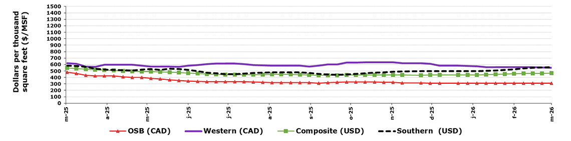 Dollars per thousand board feet | March 13, 2026 | March 6, 2026 | 4-week average | 52-weeks average |