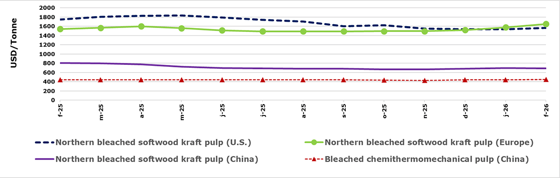 Northern bleached softwood kraft pulp (U.S.) | 1,565 | 1,535 | 1,545 | 1,675 |