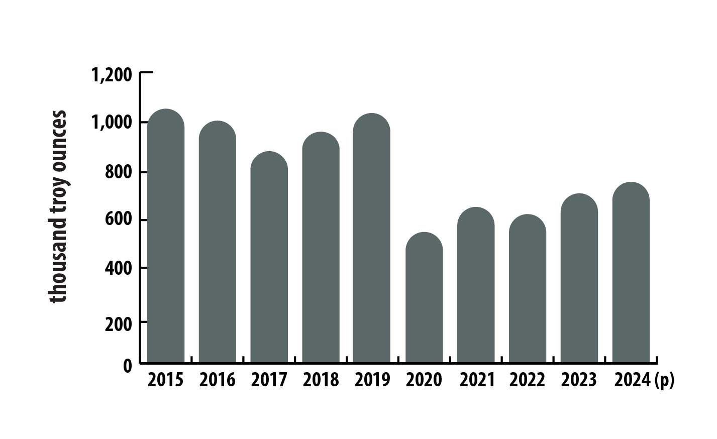 This bar graph illustrates Canada’s annual PGM mine production from 2015 to 2024. Production was 1.07 million troy ounces in 2015, falling to 879,000 troy ounces in 2017. It then rose to 1.04 million troy ounces in 2019 before dropping sharply to 541,000 troy ounces in 2020. Output rebounded to 655,000 troy ounces in 2021, dipped slightly to 626,000 troy ounces in 2022, and then increased to 702,000 troy ounces in 2023 and 746,000 troy ounces in 2024.