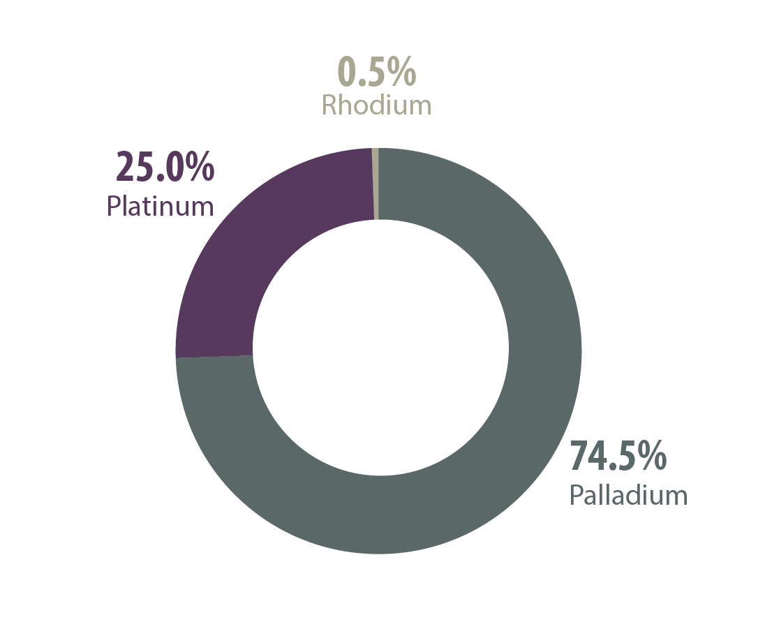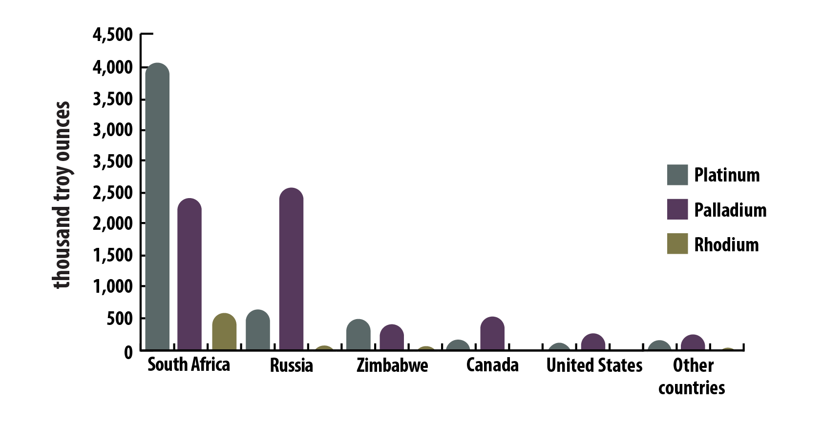 - Other countries: platinum (207,000 oz.), palladium (262,000 oz.), rhodium (22,000 oz.)