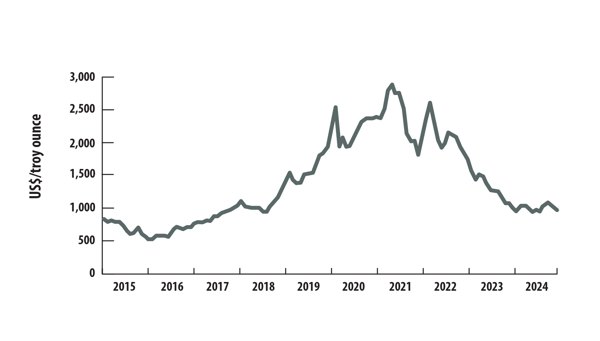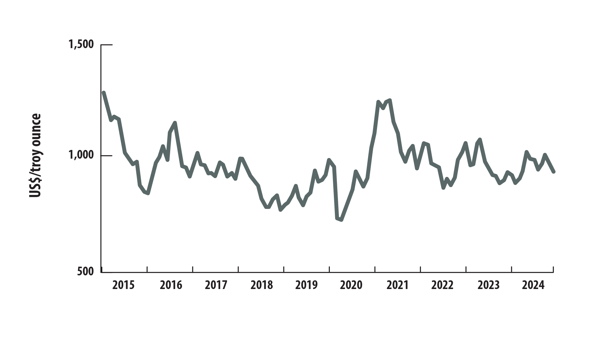 Prices peaked in 2021 at just over $1,200, with the annual average rising to $1,091 per troy ounce, before falling to $962 in 2022. From 2022 to 2024, prices again stabilized within a range of $850 to just over $1,050. In 2024, monthly prices fluctuated between $894 and $1,014 per troy ounce, resulting in an annual average of $955—virtually unchanged from the previous two years.
