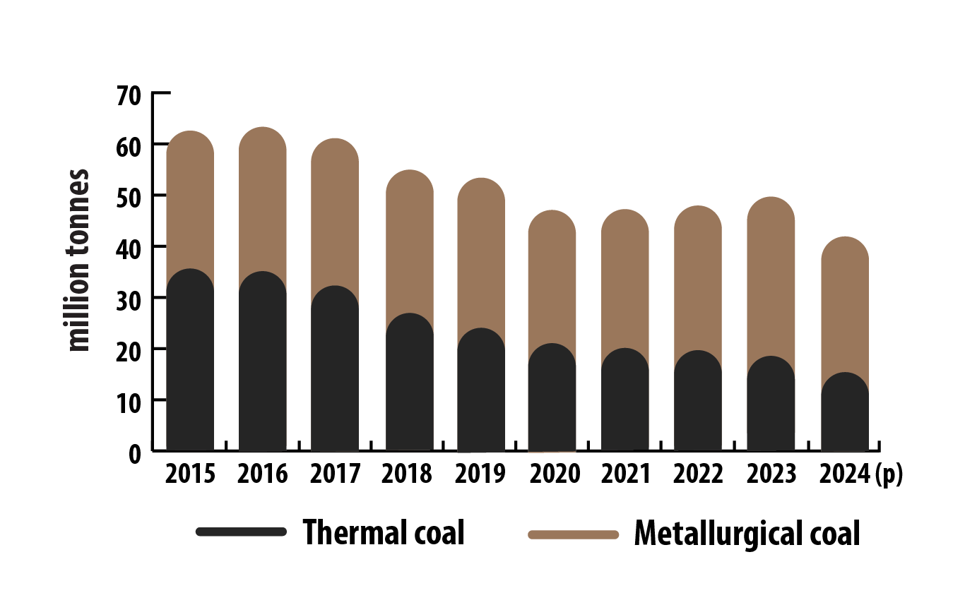 Thermal coal production was estimated to be 35.9 million tonnes in 2015 and decreased to a decade low of 14.1 million tonnes in 2024.