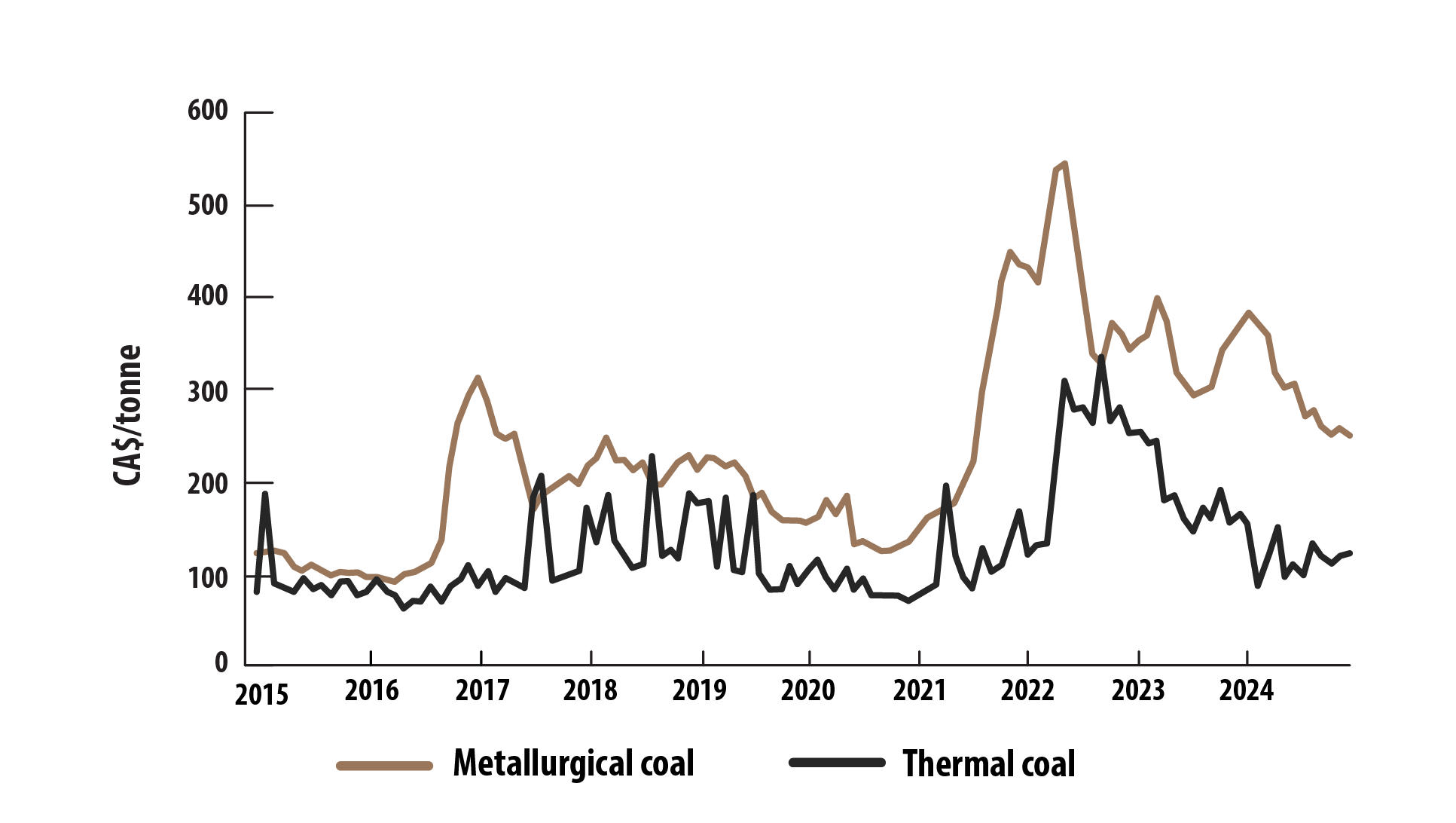This graph shows the monthly prices of Canadian coal exports from 2015 to 2024, in Canadian dollars per tonne. In 2015, both thermal and metallurgical coal were priced near $100 per tonne. Thermal coal prices fluctuated slightly in the following years before climbing steadily through 2022, then declining in late 2022 and early 2023 to near $125 per tonne. Metallurgical coal prices, in contrast, rose sharply in mid-2016, stabilized near $200 per tonne, and surged again in 2021 and 2022 before settling near $250 per tonne.