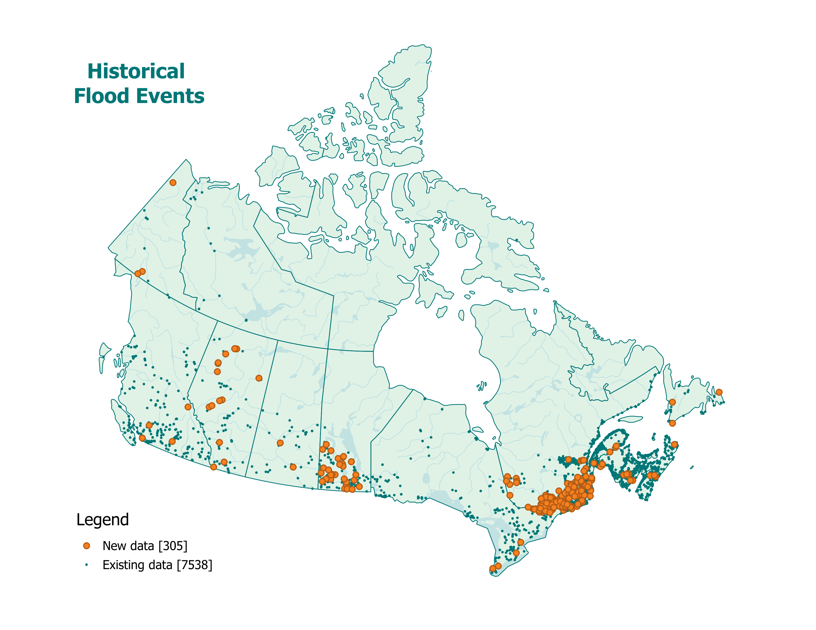 Historical flood events across Canada from 1696 to 2025. This map includes 305 newly added flood events (up to July 22, 2025), in addition to the 7,538 previously documented events.