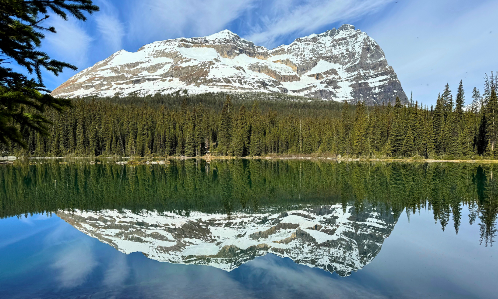 I took this picture on a very snowy July morning in Yoho National Park, B.C. We were hiking along the Lakeshore Trail around Lake O’Hara along with my 94-year-old mum and my 17-year-old son. Mount Schaefer was reflected perfectly on the lake’s glassy surface. It was magical, so calm, with only the distant hum of the Seven Veils Waterfalls, the occasional caw of a raven or cry of an eagle, and the sudden far-away thundering crash of snow cascading down from the peaks in the morning sun. It was a moment to remember. — Geordie Hobart, physical scientist