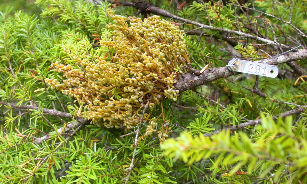 This shows the shoot growth of western hemlock dwarf mistletoe (Arceuthobium tsugense (Rosend.) subsp. tsugense) on western hemlock (Tsuga heterophylla) branches. This image was taken at Cowichan Lake on Vancouver Island, while conducting research on biological control of hemlock dwarf mistletoe, a widespread and damaging parasite in British Columbia’s coastal hemlock stands. — Simon Shamoun, research scientist